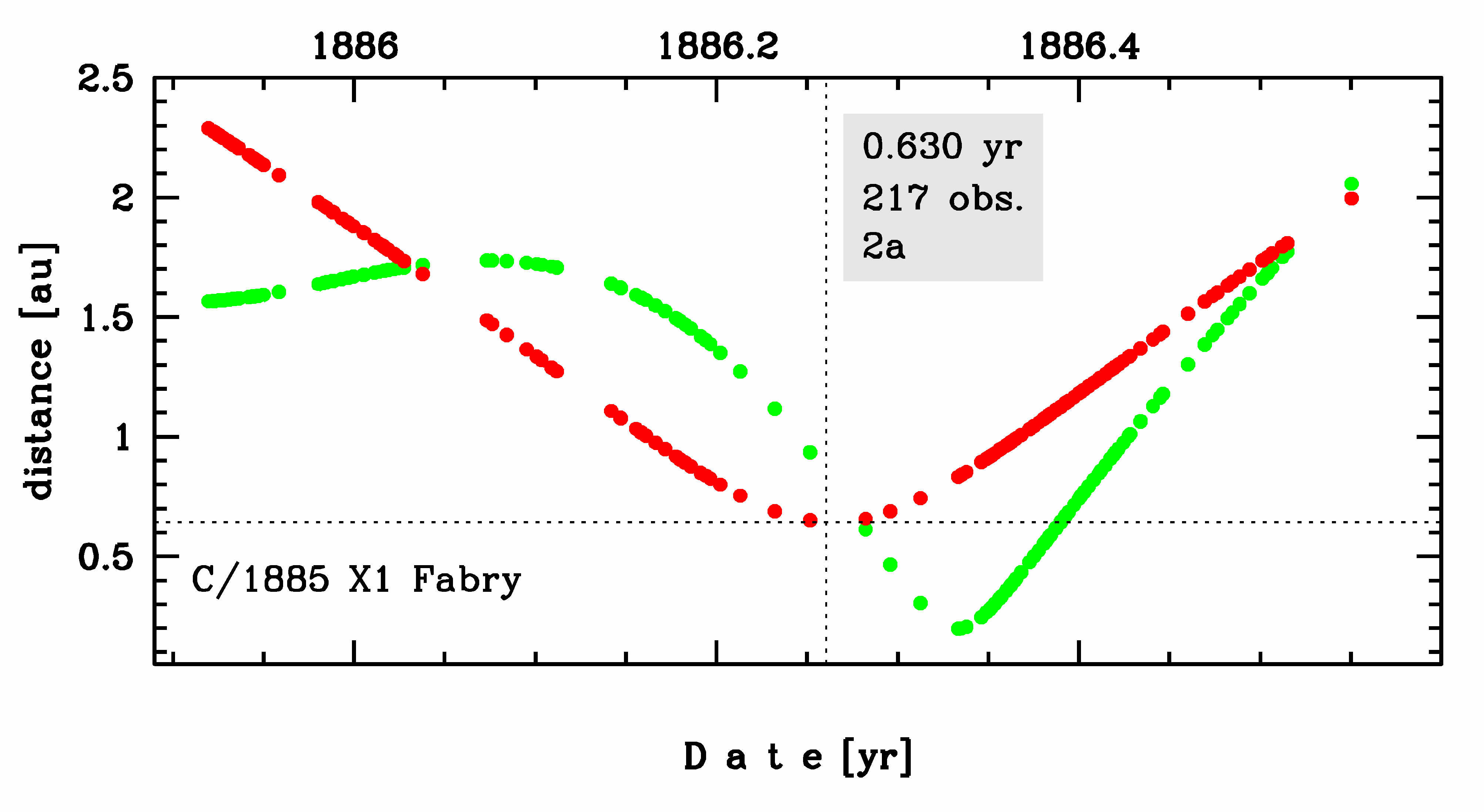 C/1885 X1 was discovered on 1 December 1885 by Louis Fabry (Paris, France), about 5 months before its perihelion passage, and the comet was last seen on 30 July 1886 [Kronk, Cometography: Volume 2].