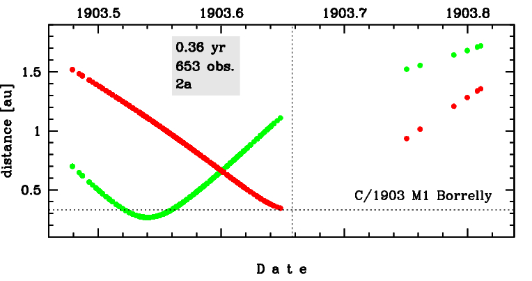 This comet made its closest approach to the Earth on 16 July 1903 (0.267 au), that is 3.5 weeks after its discovery.