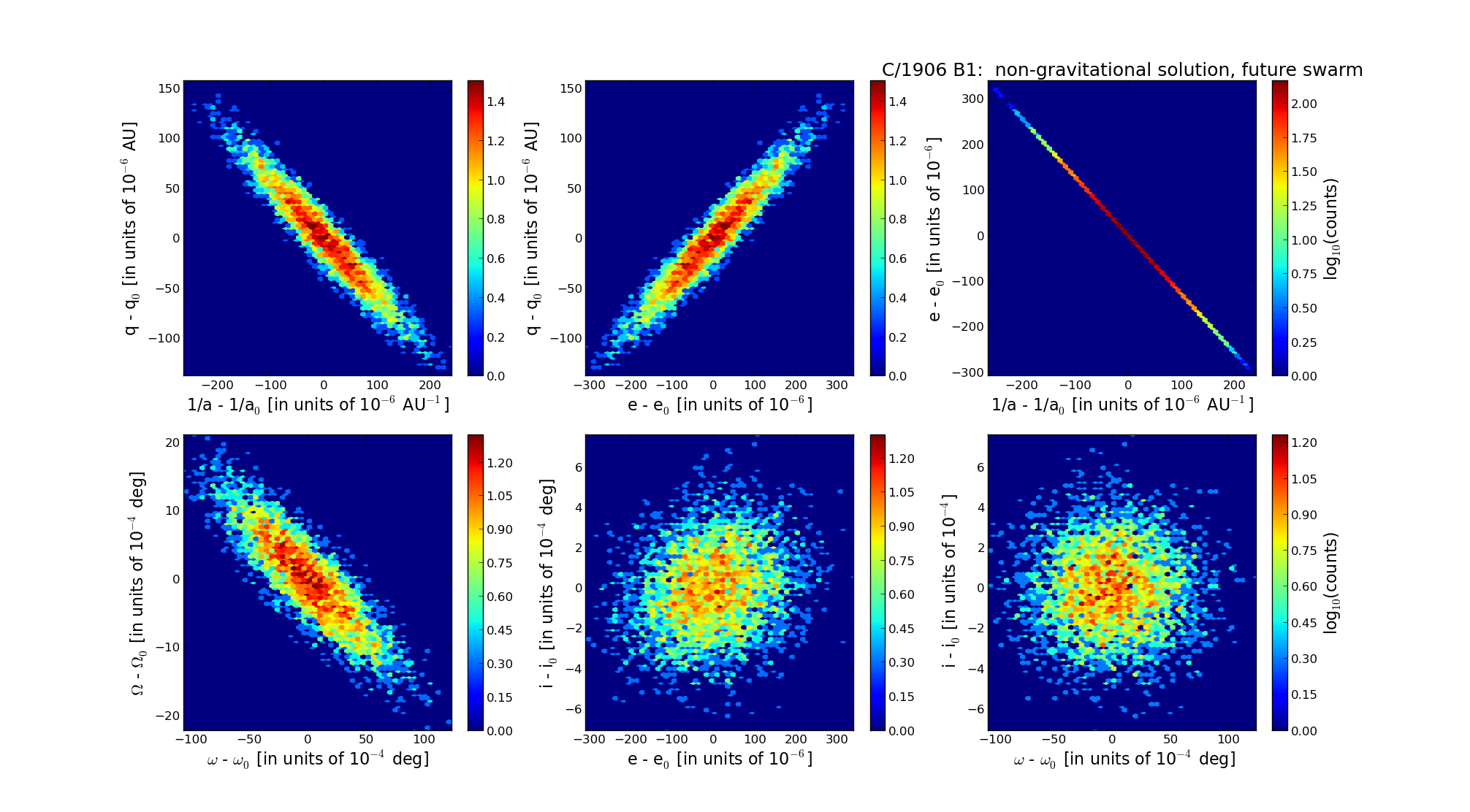 Six 2D-projections of the 6D space of future swarm including 5001 VCs. Each density map is given in logarithmic scale presented on the right in the individual panel.