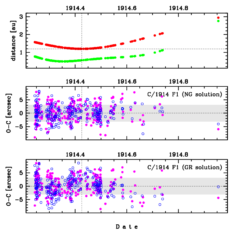 It was possible to determine the non-gravitational orbit for C/1914 F1 (preffered orbit), the RMS for NG orbit decreases (from 3.33 arcsec to 3.12 arcs) and some trends in O-C disappears (see figure). According to this model original semimajor axis of C/2014 F1 is about 1670 au.
