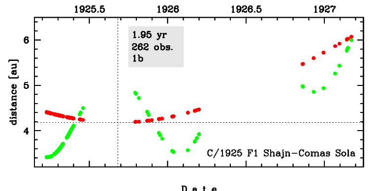 Comet C/1925 F1 was discovered on 22 March 1925, more than five months before perihelion passage, and was last seen on 4 March 1927 [Kronk, Cometography: Volume 3].