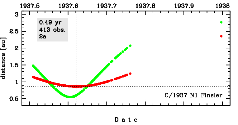 This comet made its closest approach to the Earth on 9 August 1937 (0.548 au), that is 6 days before perihelion passage.