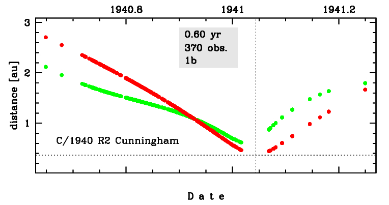 This comet made its closest approach to the Earth on 10 January 1941 (0.595 au), that is 6 days before perihelion passage.