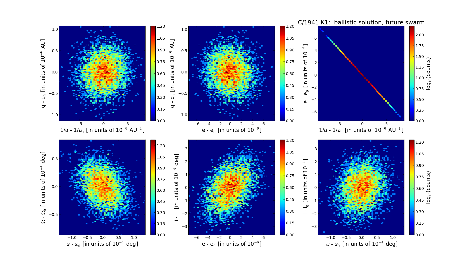 This Oort spike comet suffers small planetary perturbations during its passage through the planetary system and left the planetary zone on a slightly more tight orbit in comparison to its original barycentric orbit (see future barycentric orbit).