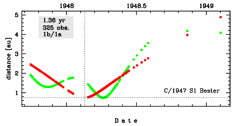 Comet C/1947 S1 was discovered on 25 September 1947 by Michiel J. Bester (Boyden Station of Harvard College Observatory, Bloemfontein, South Africa), that is about 4.7 months before perihelion passage, and the comet was last seen on 6 February 1949. [Kronk, Cometography: Volume 4].