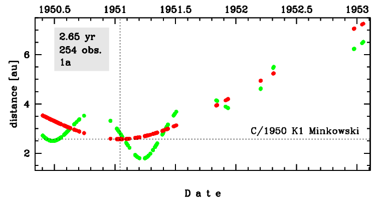This comet made its closest approach to the Earth on 23 March 1951 (1.774 au), that is over two months after perihelion passage.