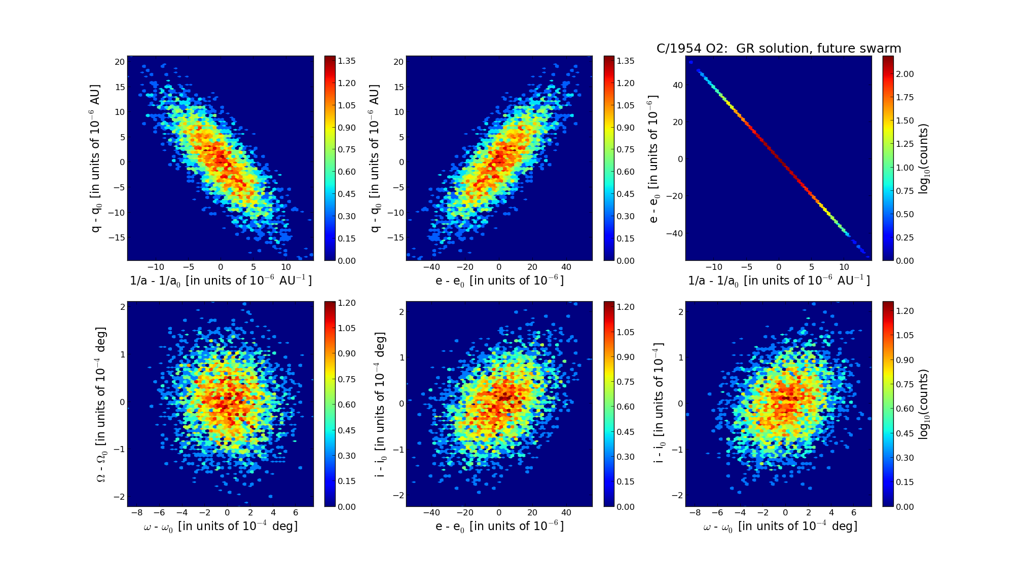 This Oort spike comet suffers small planetary perturbations during its passage through the planetary system that lead to a tighter future orbit (see original and future barycentric orbits).