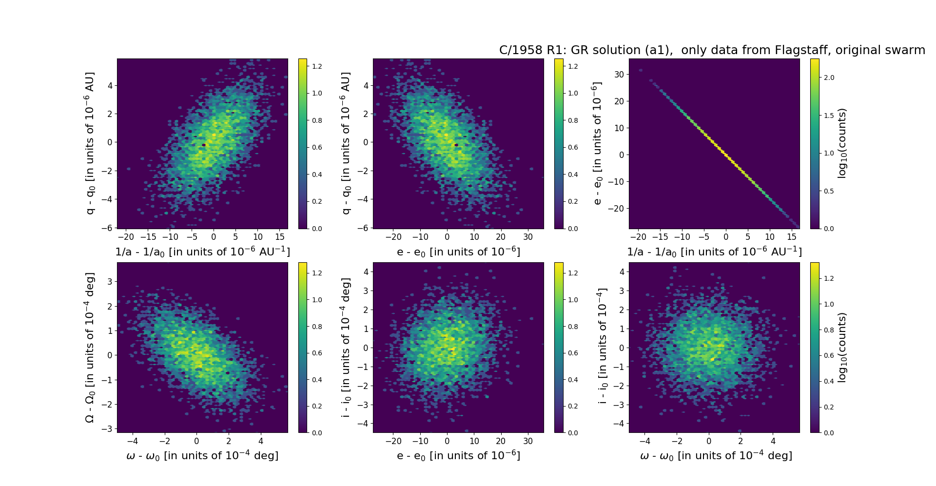 Comet had its closest approach to the Earth on 19 September 1958 (1.92 au, at this moment comet was 2.74 au from the Sun) and 18 March 1959 (1.94 au, six days after its perihelion passage).The MPC cometary database presents GR orbit based of 85 positional observations (data arc: 1958 09 07 – 1960 04 21), however only 40 observations obtained in Flagstaff are available in the MPC (data arc: 1958 09 14 – 1960 04 21), and the JPL offers GR osculating orbit based on this data set. We additionally collected observations from Yerkes, McDonald and Skalnaté Pleso observatories published in literature, and orbits 'ba' (GR) and 'bn' (NG) are based on 95 positional measurements (data arc: 1958 09 12 – 1960 04 21). For comparison purposes, we also presented orbits (GR and NG) using only Flagstaff data set (this set gives notable better rms for both types of orbits).