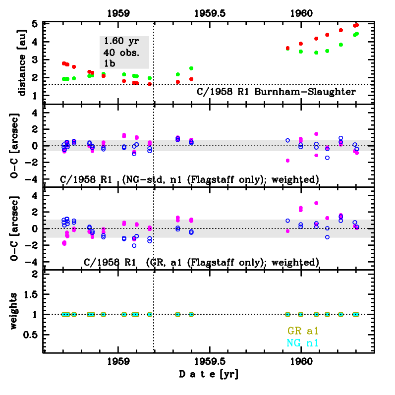 Comet had its closest approach to the Earth on 19 September 1958 (1.92 au, at this moment comet was 2.74 au from the Sun) and 18 March 1959 (1.94 au, six days after its perihelion passage).The MPC cometary database presents GR orbit based of 85 positional observations (data arc: 1958 09 07 – 1960 04 21), however only 40 observations obtained in Flagstaff are available in the MPC (data arc: 1958 09 14 – 1960 04 21), and the JPL offers GR osculating orbit based on this data set. We additionally collected observations from Yerkes, McDonald and Skalnaté Pleso observatories published in literature, and orbits 'ba' (GR) and 'bn' (NG) are based on 95 positional measurements (data arc: 1958 09 12 – 1960 04 21). For comparison purposes, we also presented orbits (GR and NG) using only Flagstaff data set (this set gives notable better rms for both types of orbits).