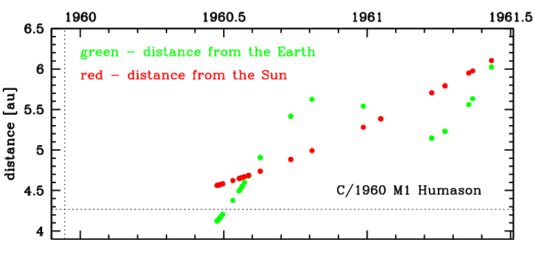 Comet C/1960 M1 was discovered on 18 June 1960, 6.5 months after perihelion passage, and was last seen on 7 June 1961 [Kronk and Meyer, Cometography: Volume 5].