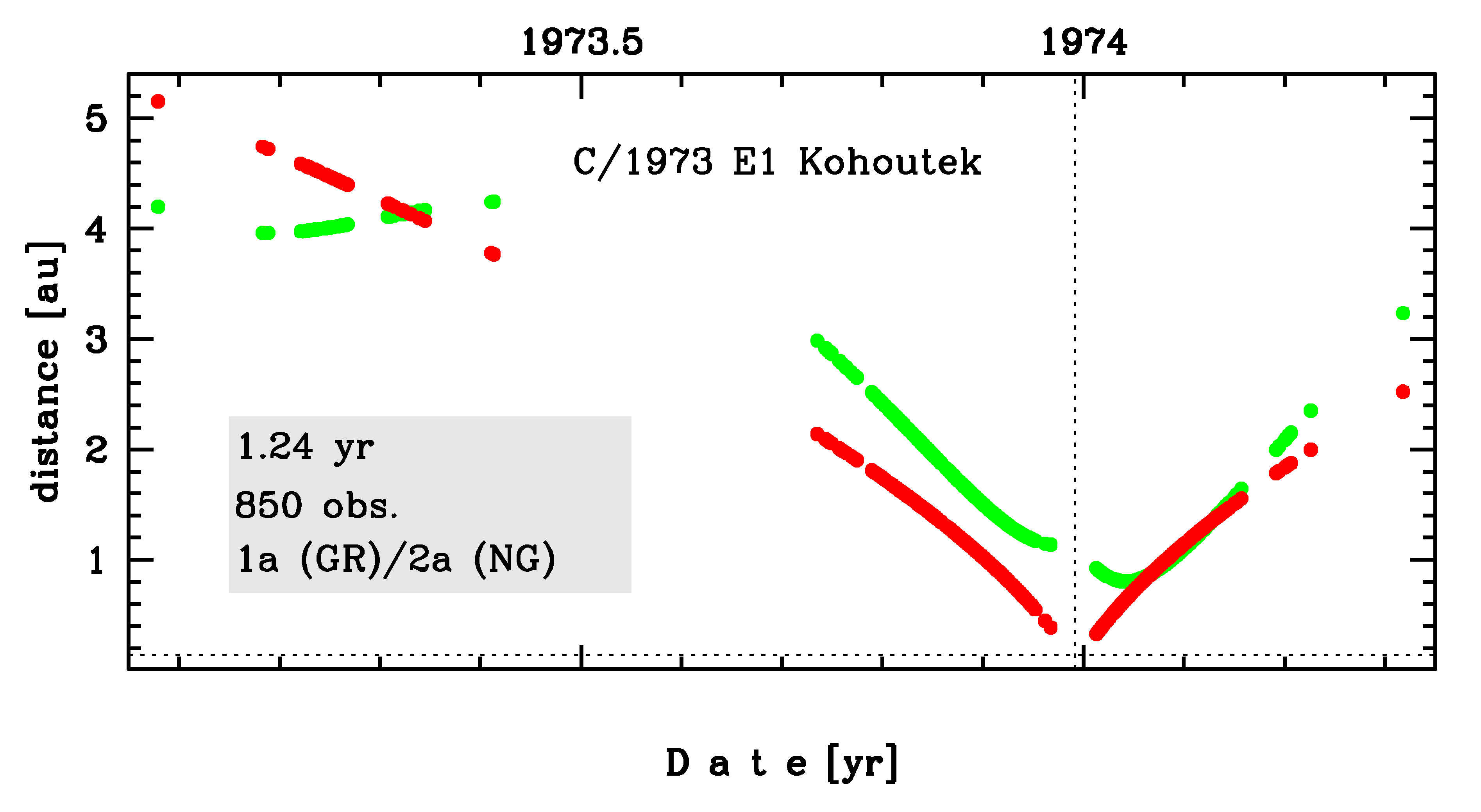 Comet C/1973 E1 was discovered on 7 March 1973 by Luboš Kohoutek (Hamburg Observatory, Bergerdorf, Germany), that is 9 months and 3 weeks before its perihelion passage.Later, a prediscovery observation was found taken on 28 January at the same place. This comet was observed until 10 November 1974 [Kronk, Cometography: Volume 5].