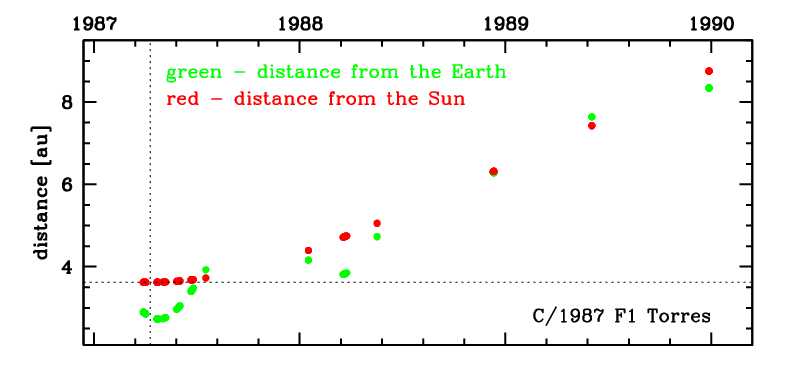 Comet C/1987 F1 was discovered by Carlos Torres (at Cerro El Roble) on 28 March 1987 (IAUC 4355), two weeks before its perihelion passage. The comet was last seen on 27 December 1989.