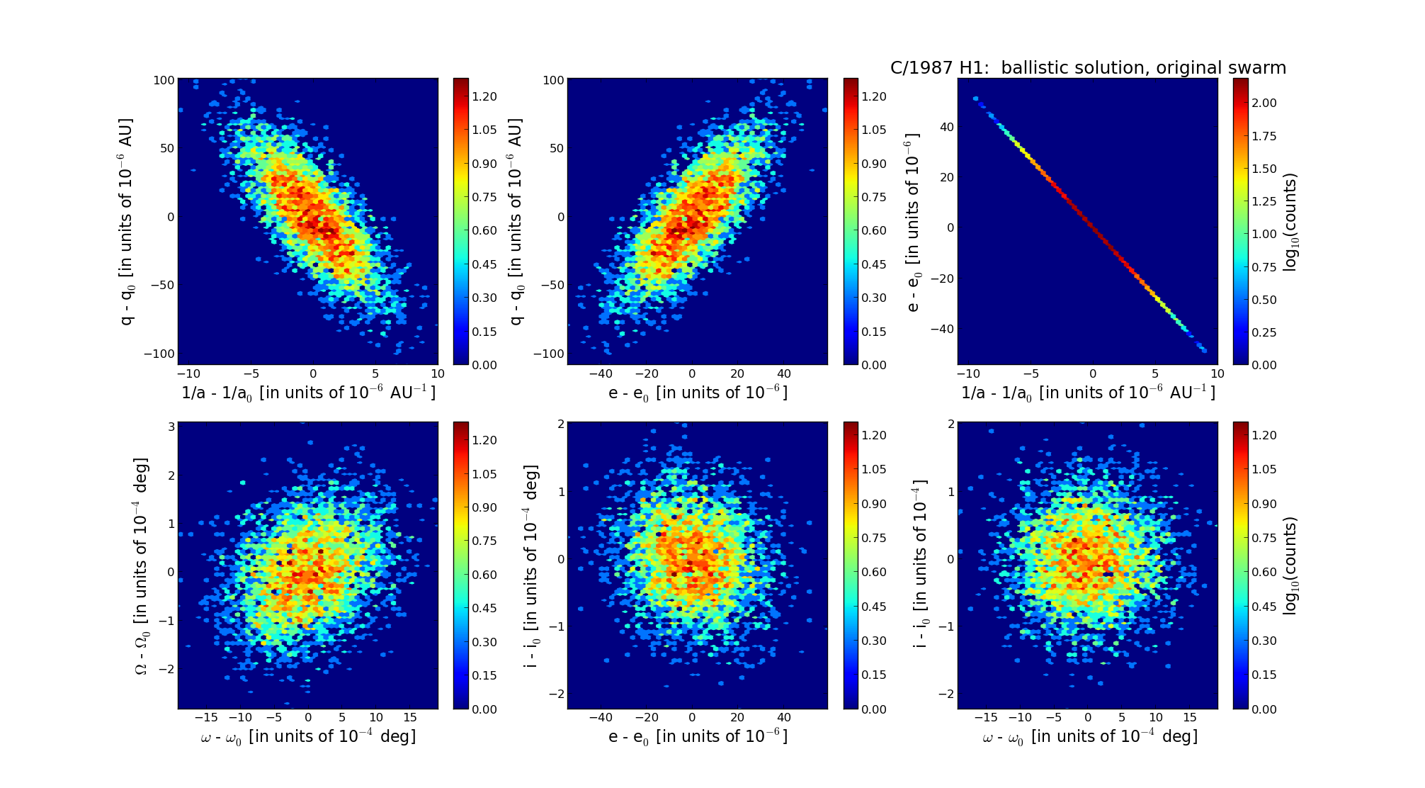 Six 2D-projections of the 6D space of original swarm including 5001 VCs. Each density map is given in logarithmic scale presented on the right in the individual panel.
