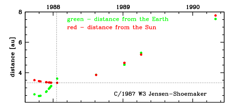 C/1987 W3 made its closest approach to the Earth on 17 October 1987 (2.47 au), that was three months before its perihelion passage.
