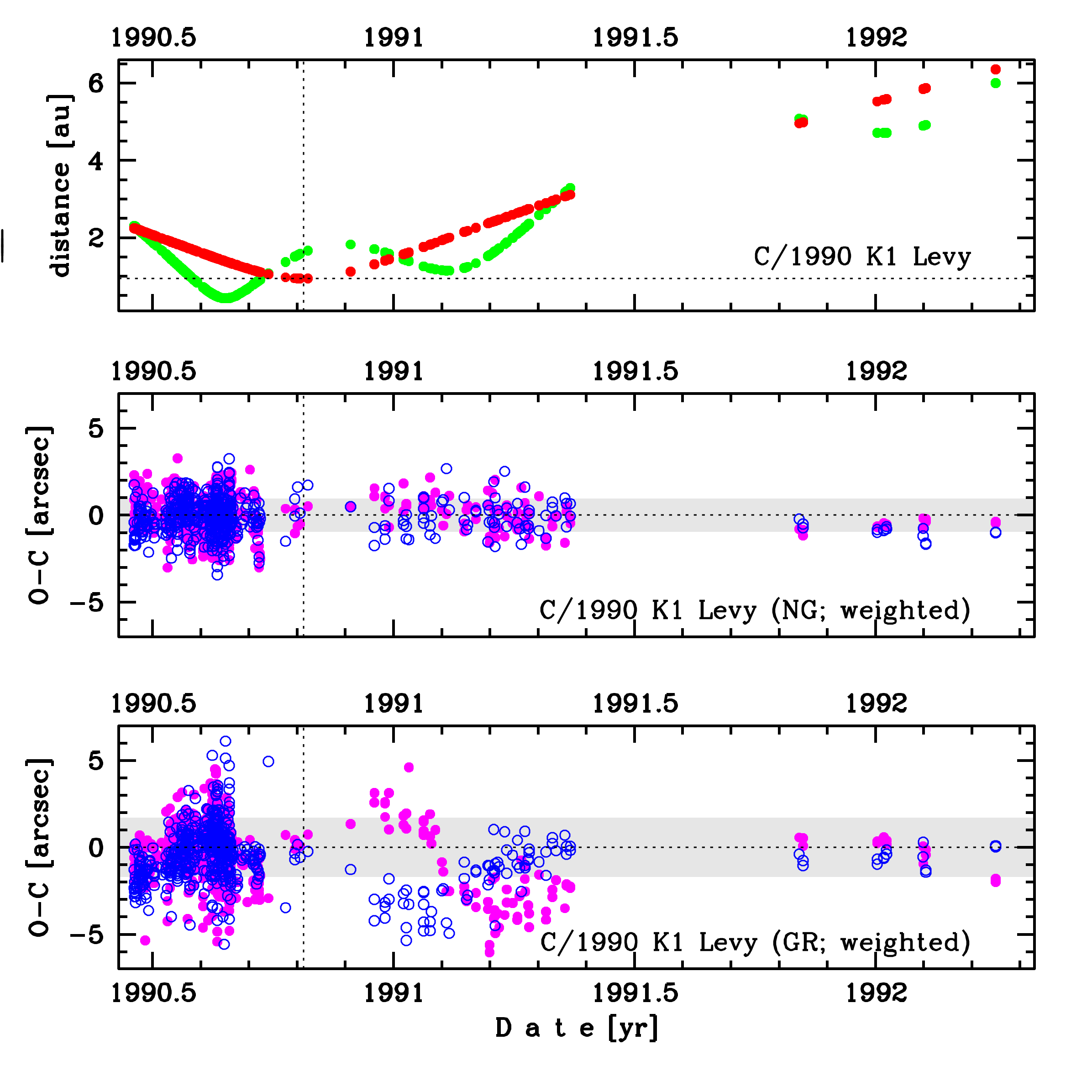 Upper panel: Time distribution of positional observations with corresponding heliocentric (red curve) and geocentric (green curve) distance at which they were taken. The horizontal dotted line shows the perihelion distance for a given comet whereas vertical dotted line — the moment of perihelion passage.