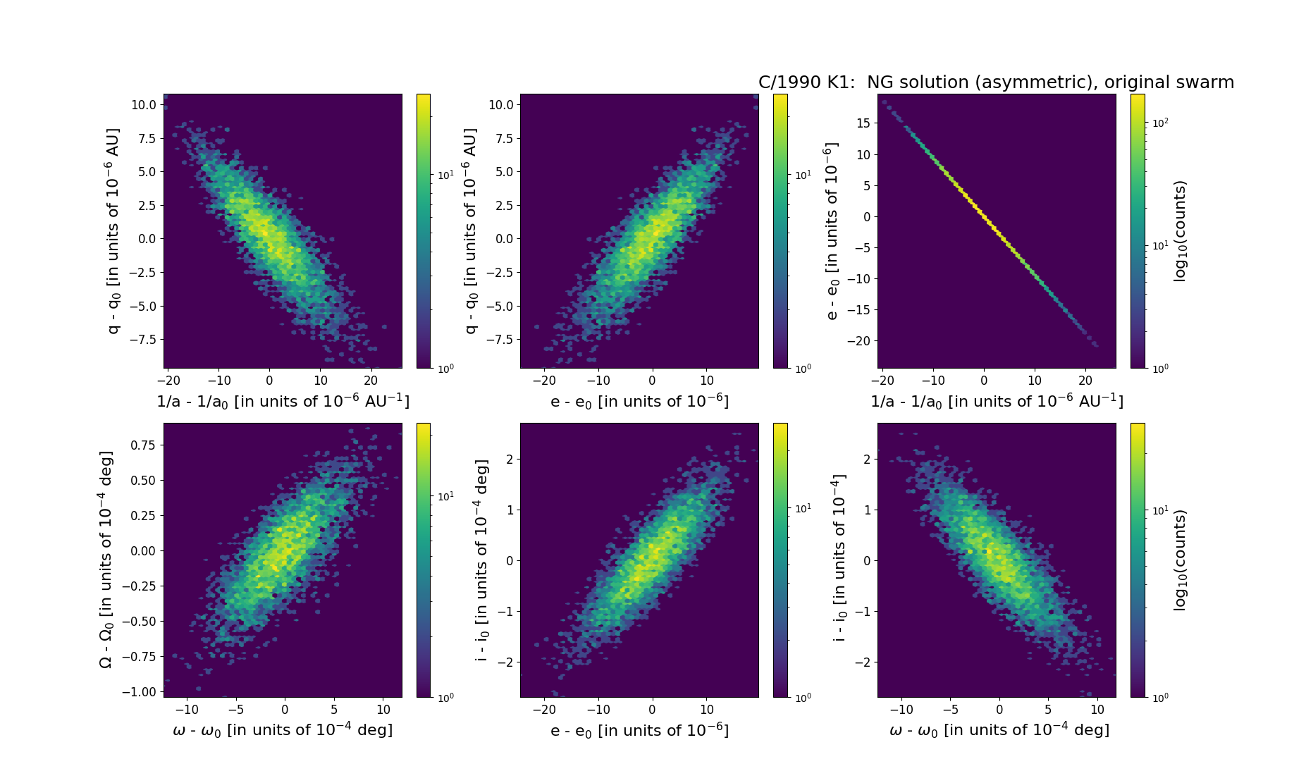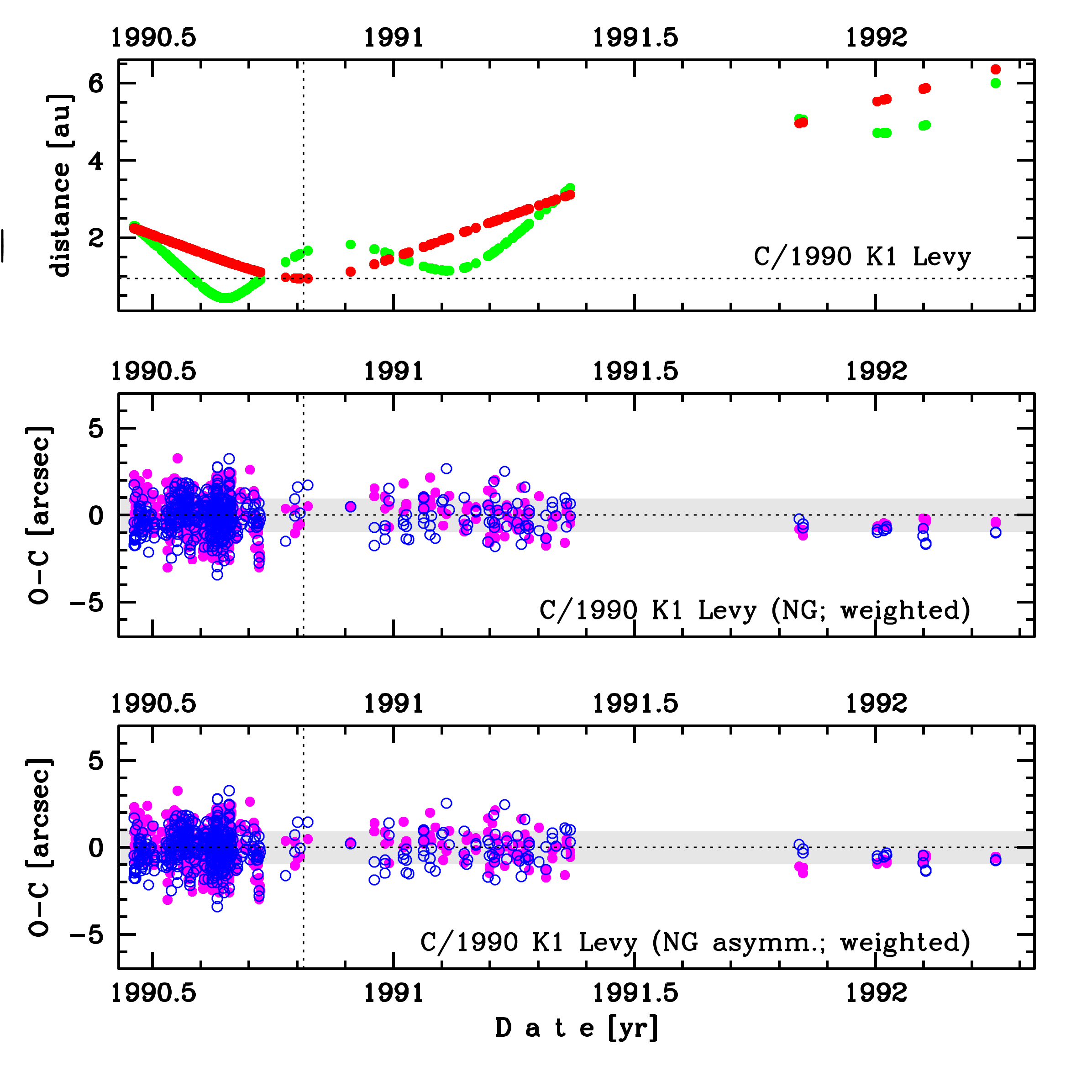 Preferred solution given here is based on data spanning over 1.86 yr in a range of heliocentric distances: 2.57 au – 0.939 au (perihelion) – 6.36 au. However, also two other non-gravitational solutions are given: bn solution based on pre-perihelion data, and rn solution based on post-perihelion data.