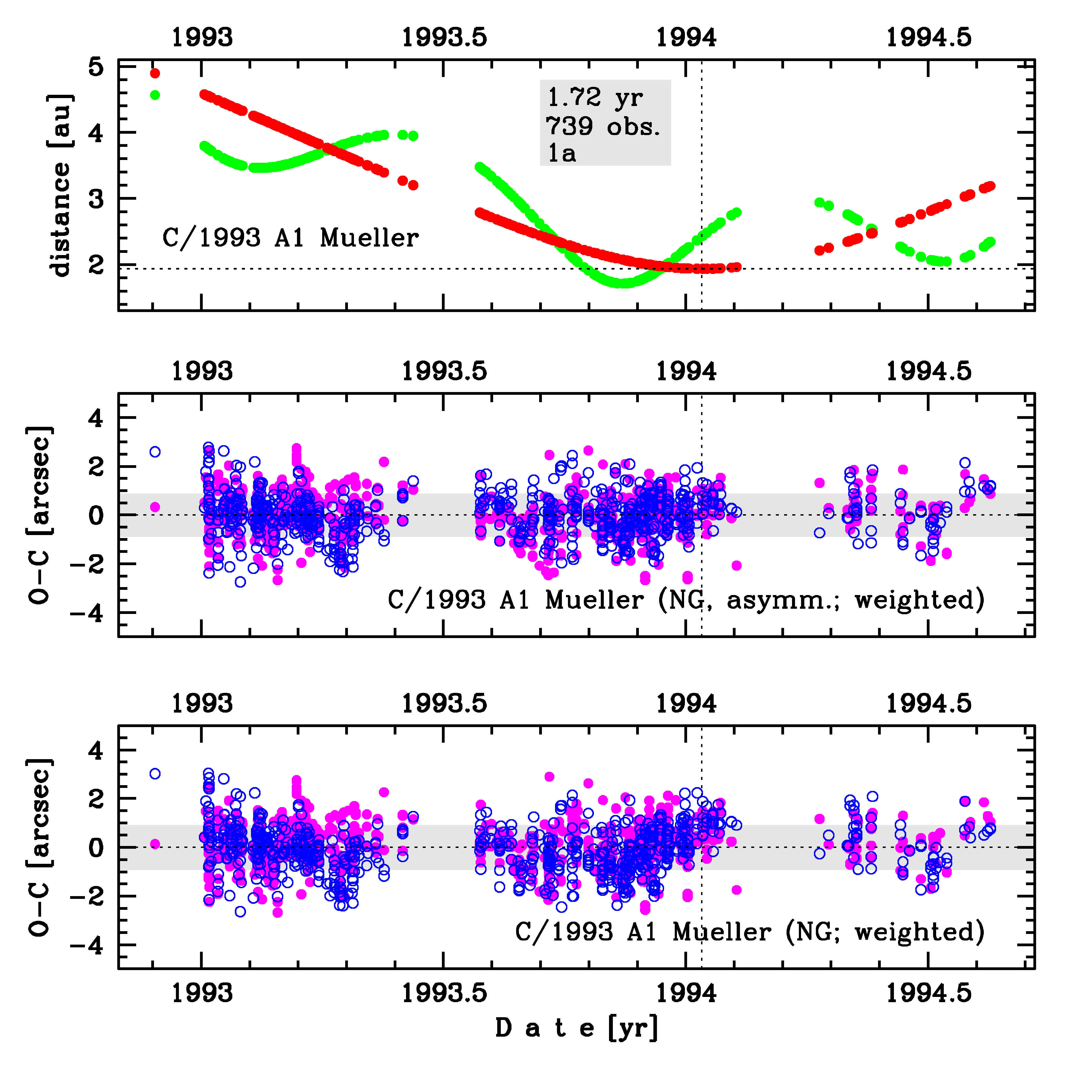 Comet C/1993 A1 was discovered on 2 January 1993 by Jean Mueller (Palomar Sky Survey II). Later, a prediscovery image of this comet taken on 26 November 1992 (Catalina Station, Tucson) was found.At the moment of discovery, this comet was a year before its perihelion passage and it was last observed in the mid-August 1994.