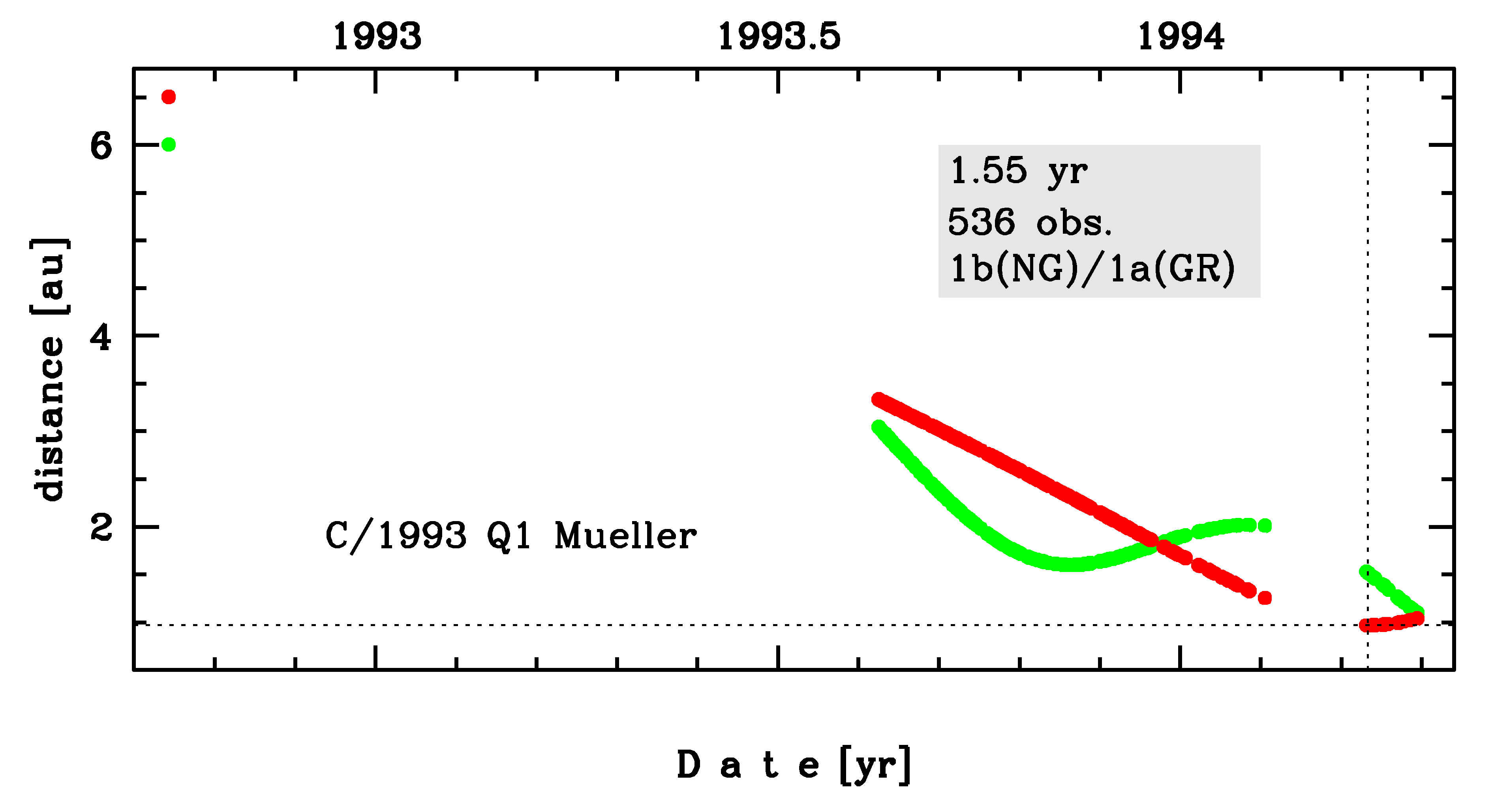 Comet C/1993 Q1 was discovered on 16 August 1993 by Jean Mueller (Palomar Sky Survey II). Later, a prediscovery image of this comet taken on 28 September 1992 (Palomar Mountain-DSS) was found. At the moment of discovery, this comet was about 7.5 months before its perihelion passage and it was last observed in the mid-April 1994.