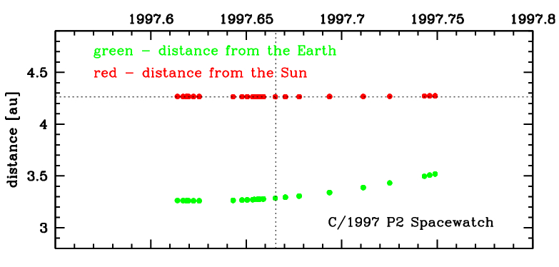 C/1997 P2 passed close to Jupiter six months before perihelion passage (0.652 au, 25 February 1997).