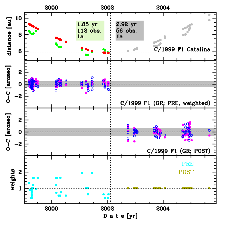 Comet C/1999 F1 was discovered on 23 March 1999 by the Catalina Sky Survey, 2.9 yr before perihelion passage. In April, orbit determination by B.G. Marsden showed that the object was a long-period comet moving on a hightly-inclined orbit, and allowed to find the pre-discovery observations in Spacewatch data [IAUC 7148, 1999 April 20].