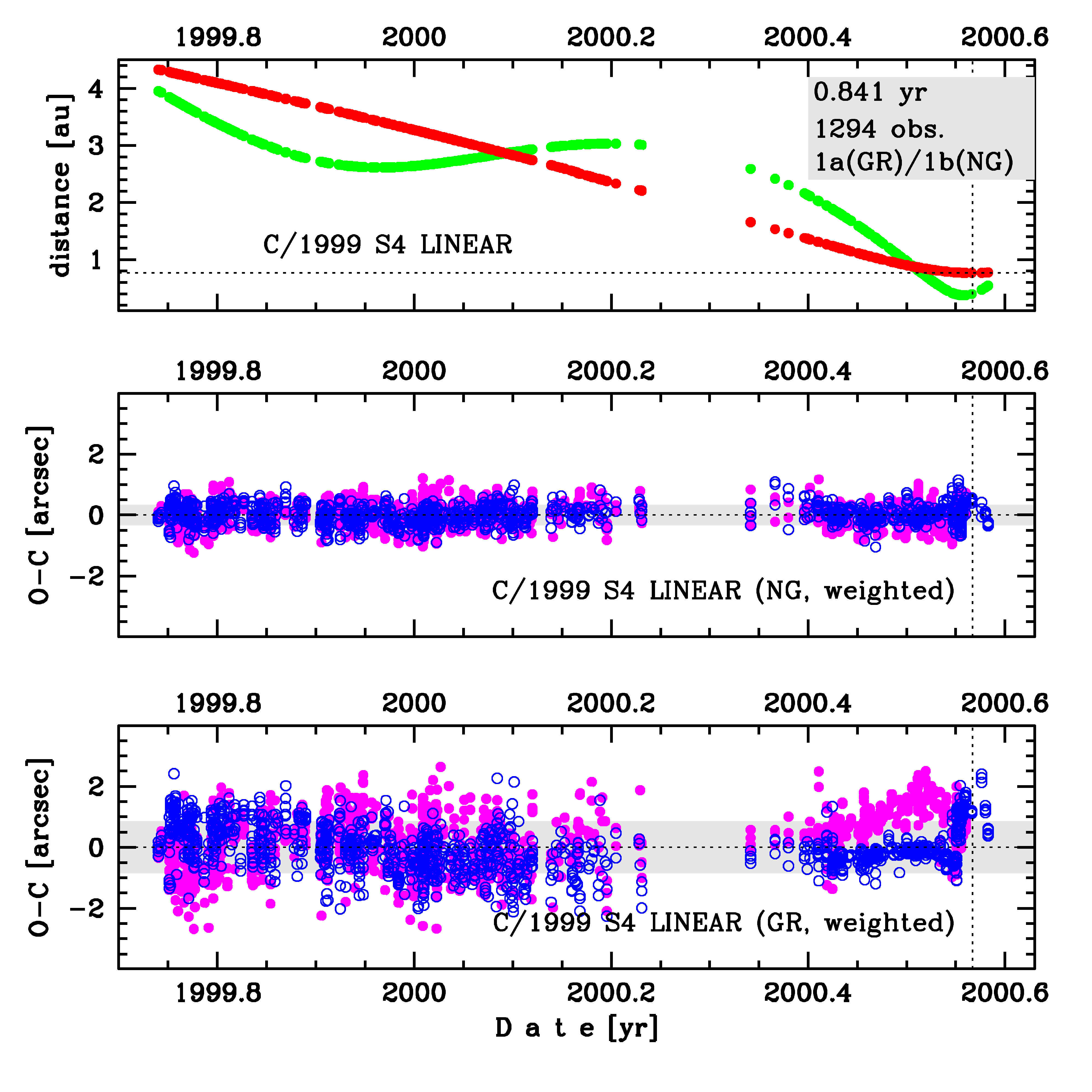 Therefore, preffered solution given here is based on pre-perihelion data spanning over 0.770 yr in a range of heliocentric distances from 4.33 au to 0.861 au (5 July 2000).