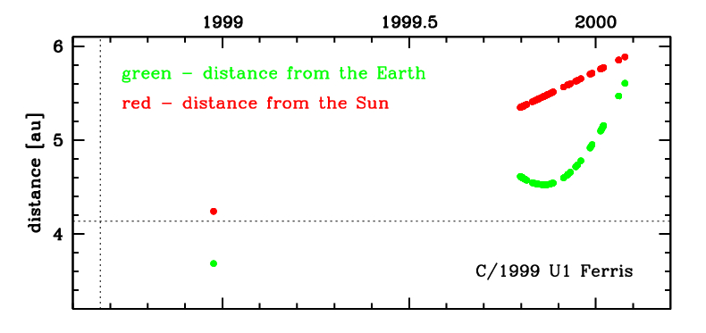 C/1999 U1 was discovered on 18 October 1999 by W.D. Ferris of LONEOS team [IAUC 7283, 1999 October 18]. Later, pre-discovery measurements taken by Siding Spring on 22 December 1998 were found.
