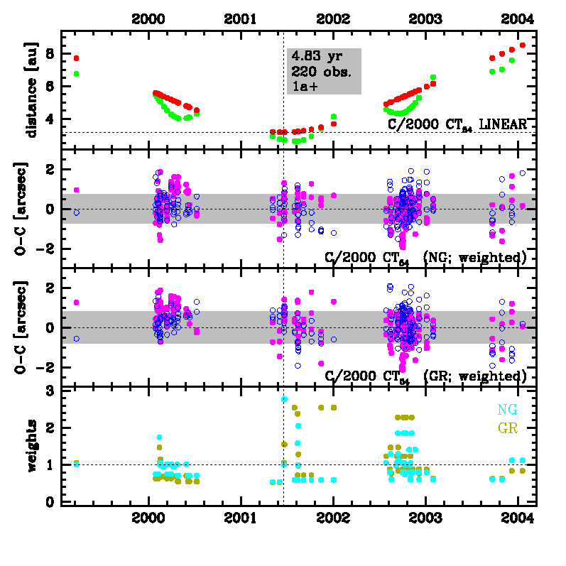 Non-gravitational solution is based on data span over 4.8 yr in a range of heliocentric distances: 7.72 au – 3.156 au (perihelion) – 8.52 au.