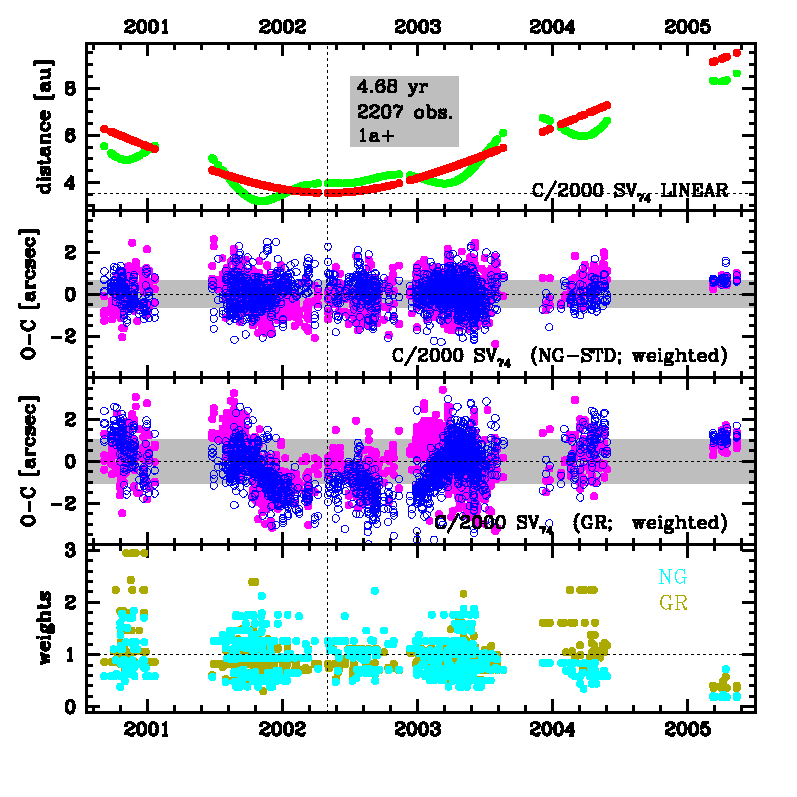 C/2000 SV74 was observed 4.7 yr in a range of heliocentric distances: 6.26 au – 3.542 au (perihelion) – 9.51 au.