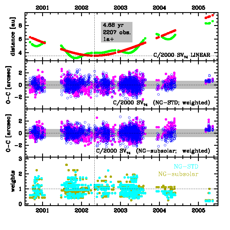 C/2000 SV74 was observed 4.7 yr in a range of heliocentric distances: 6.26 au – 3.542 au (perihelion) – 9.51 au.