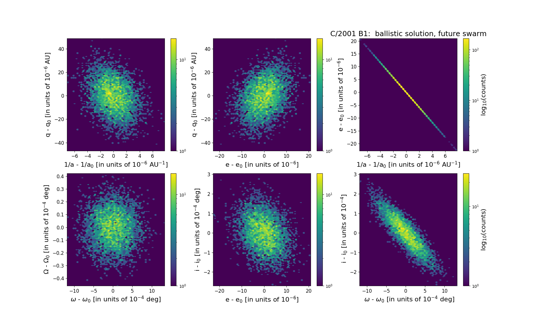 Six 2D-projections of the 6D space of future swarm including 5001 VCs. Each density map is given in logarithmic scale presented on the right in the individual panel.