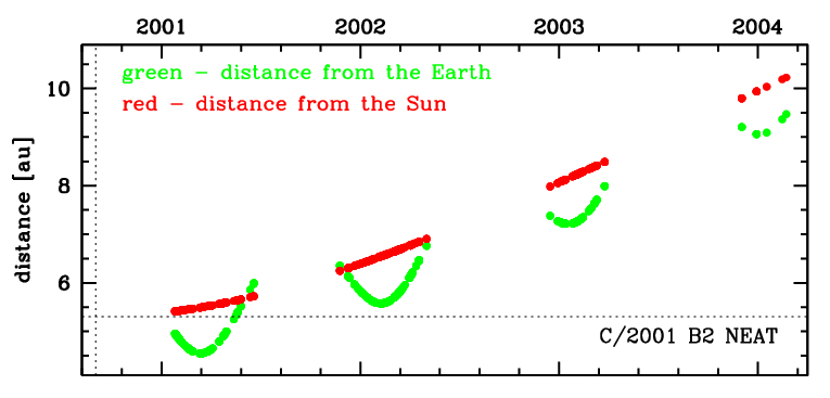 Comet C/2001 B2 was discovered on 24 January 2001, almost five months after perihelion passage, and next observed 3.1 yr during its four oppositions in a range of heliocentric distances: 5.42 au – 5.306 au (perihelion) – 10.23 au.