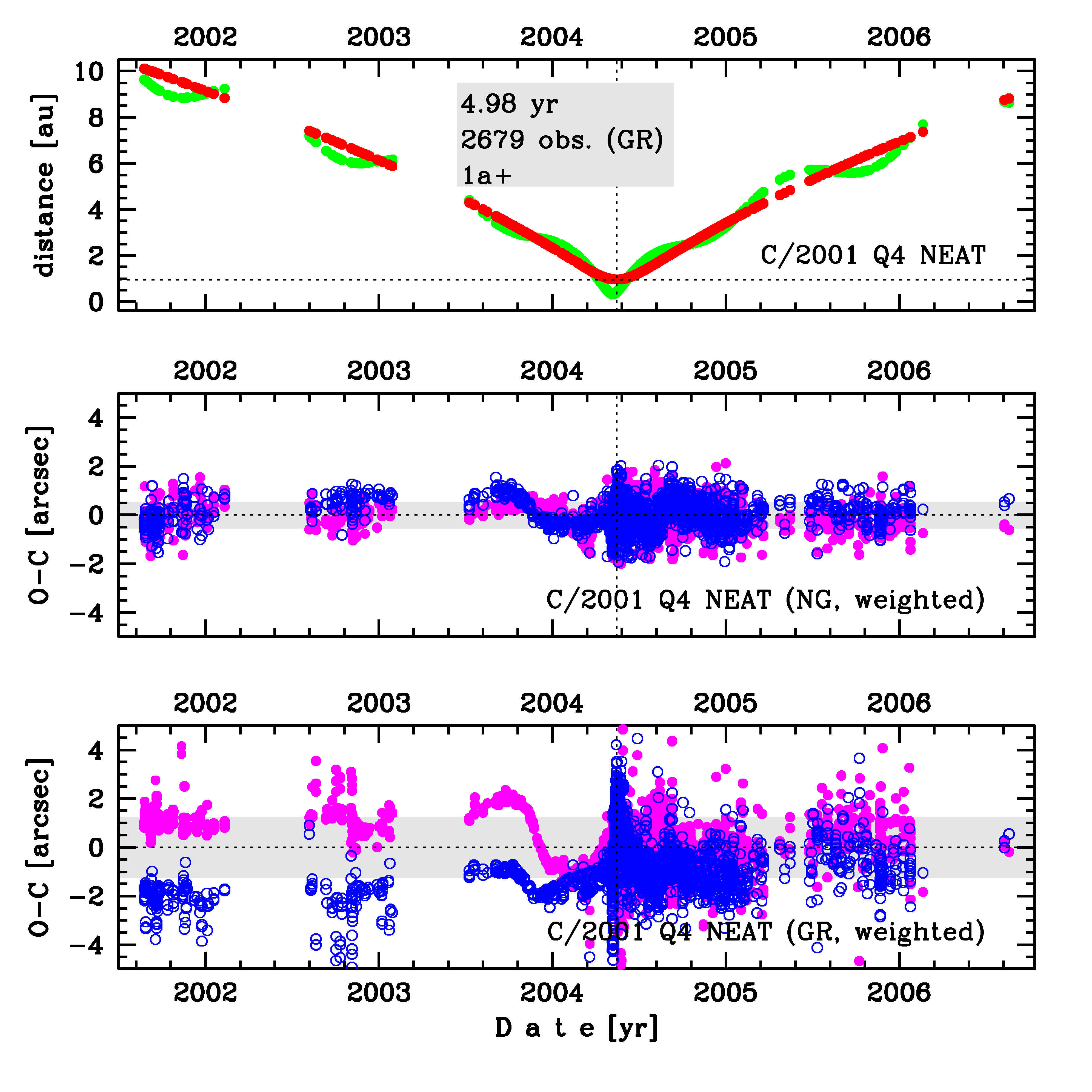 | detectability of NG effects in the comet's motion | comet with NG effects strongly manifested in positional data fitting | |