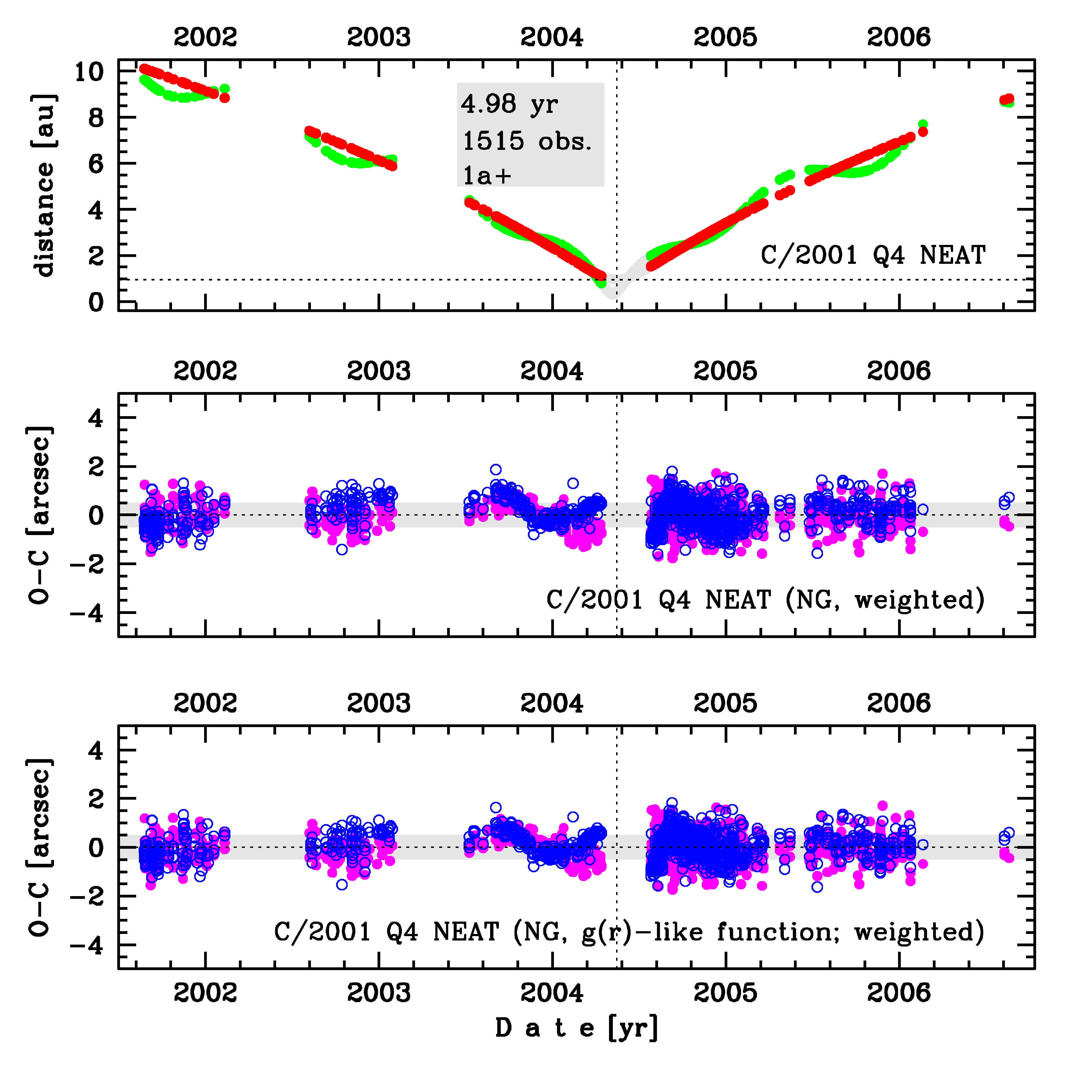 Upper panel: Time distribution of positional observations with corresponding heliocentric (red curve) and geocentric (green curve) distance at which they were taken. The horizontal dotted line shows the perihelion distance for a given comet whereas vertical dotted line — the moment of perihelion passage.