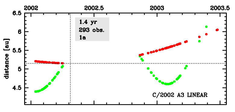 | range of heliocentric distances | 5.21 au – 5.15 au (perihelion) – 6.05 au | |