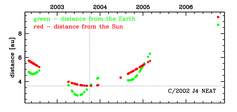 C/2002 J4 was discovered on 13 May 2002 by the NEAT as an apparently cometary object. Additional observations confirmed its cometary apperance. At once, pre-discovery detections made by LONEOS and LINEAR on 4—8 May were found [IAUC 7899, 2002 May 13].