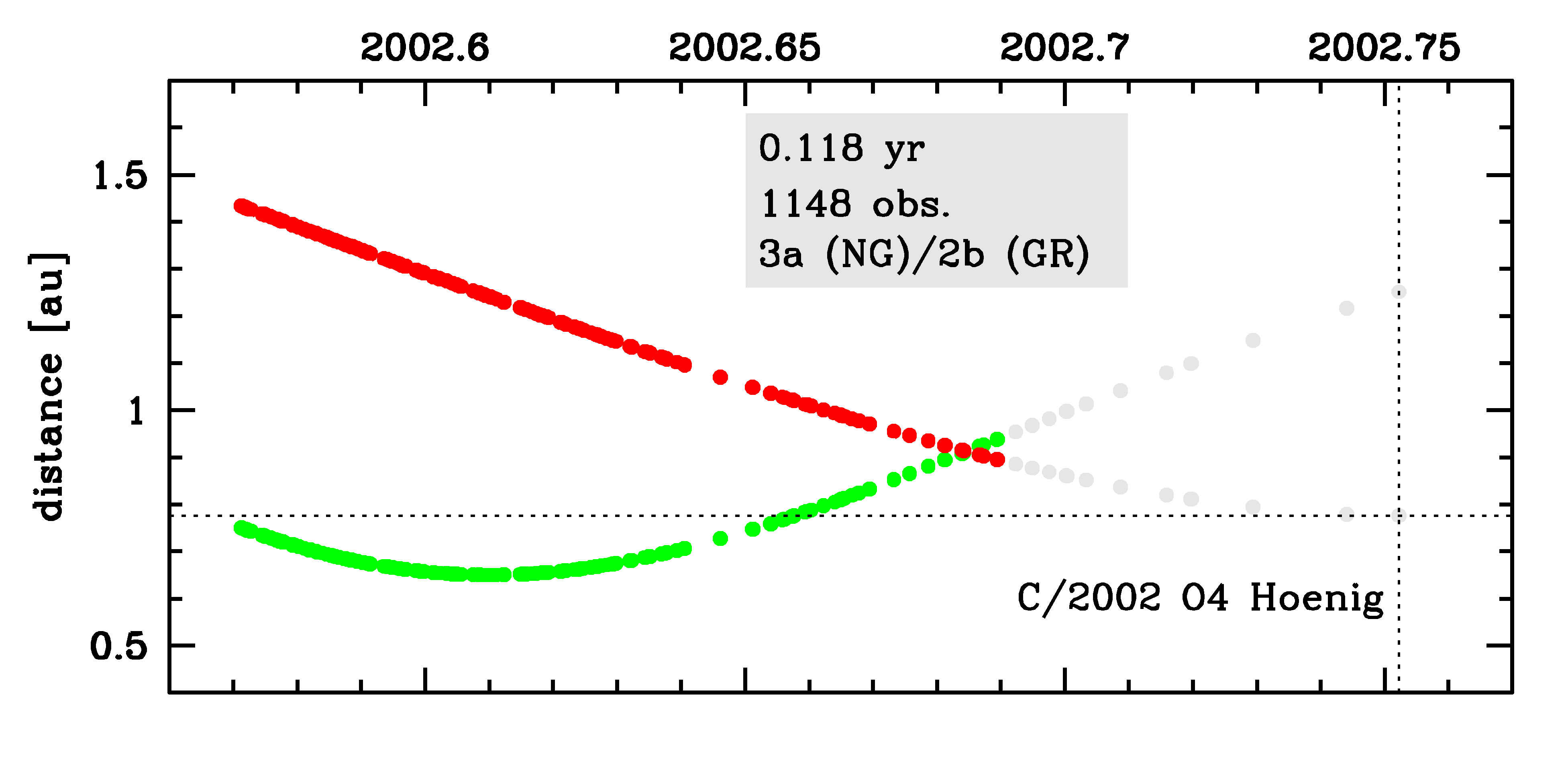 Observers reported that C/2002 O4 started to disintegrate a few days before the perihelion, then faded very rapidly prior to perihelion passage; and in mid-October 2002, it was no longer possible to see this comet. Sekanina (2002) speculated that the comet was undergoing a major outburst near the time of its discovery (27 July 2002) and that a major loss of mass triggered by this episode completed in mid-August. The data arc for this comet is extremely short (two months); however, NG effects are easy detectable in its motion.