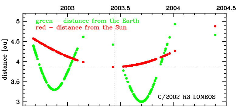 C/2002 R3 was discovered on 4 September 2002 by the LONEOS as an apparently asteroidal object. A few days later its cometary apperance was reported by observers [IAUC 7970, 2002 September 14].