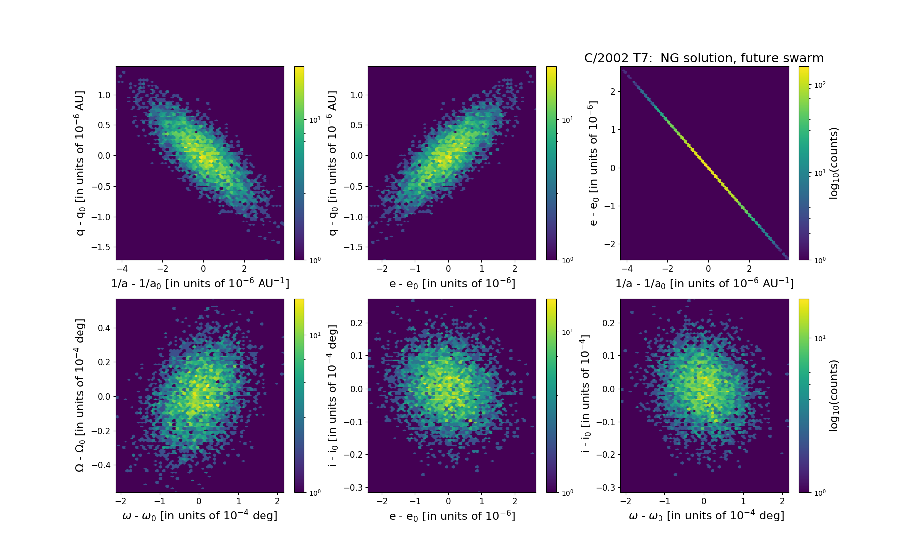 A few other solutions based only of data taken before perihelion are also shown. Three are based on data until 4 December 2003 (p8, pn, pc) and one on shorter data-arc – until 17 April 2004 (p8). This last solution (p8) is about one year shorter than the previous solutions, and is limited to data taken well before the perihelion passage to the heliocentric distance of 2.5 au. This approach on the one hand allowed a reduction in the undesired effects associated with possible outburst events in this comet, and on the other hand allowed maintaining a very good quality orbit (quality reduction from class 1a+ to 1a) that can be used to the dynamical calculations back in time.