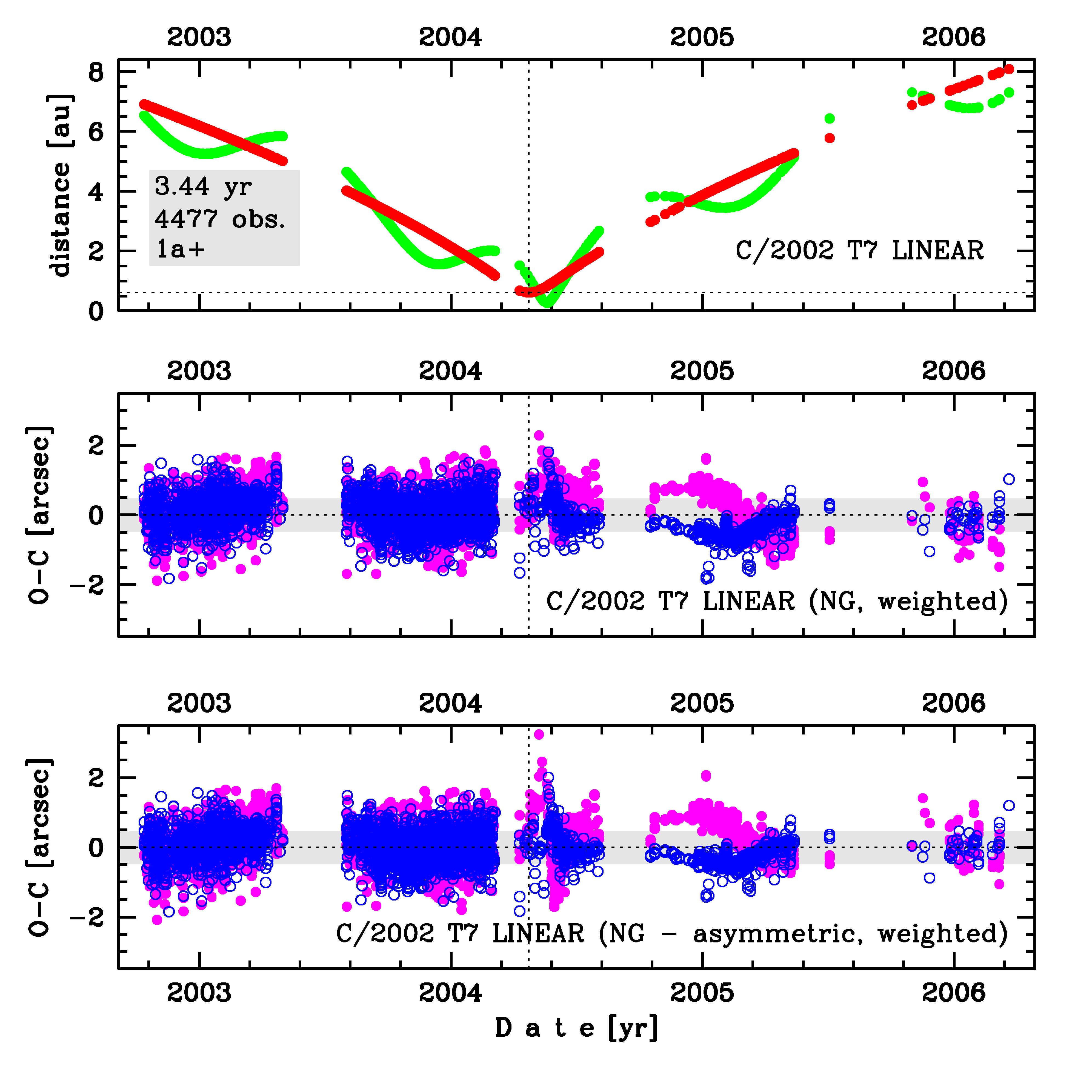 A few other solutions based only of data taken before perihelion are also shown. Three are based on data until 4 December 2003 (p8, pn, pc) and one on shorter data-arc – until 17 April 2004 (p8). This last solution (p8) is about one year shorter than the previous solutions, and is limited to data taken well before the perihelion passage to the heliocentric distance of 2.5 au. This approach on the one hand allowed a reduction in the undesired effects associated with possible outburst events in this comet, and on the other hand allowed maintaining a very good quality orbit (quality reduction from class 1a+ to 1a) that can be used to the dynamical calculations back in time.