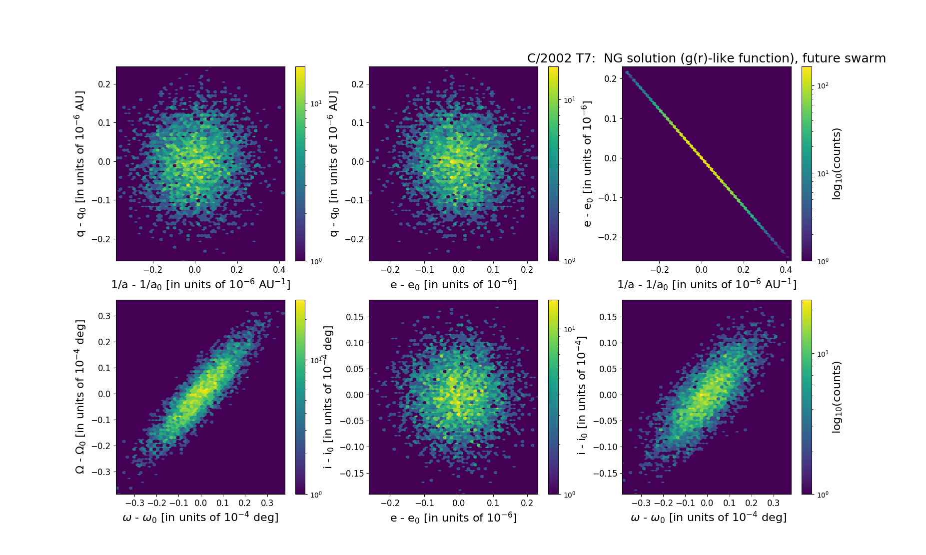 A few other solutions based only of data taken before perihelion are also shown. Three are based on data until 4 December 2003 (p8, pn, pc) and one on shorter data-arc – until 17 April 2004 (p8). This last solution (p8) is about one year shorter than the previous solutions, and is limited to data taken well before the perihelion passage to the heliocentric distance of 2.5 au. This approach on the one hand allowed a reduction in the undesired effects associated with possible outburst events in this comet, and on the other hand allowed maintaining a very good quality orbit (quality reduction from class 1a+ to 1a) that can be used to the dynamical calculations back in time.