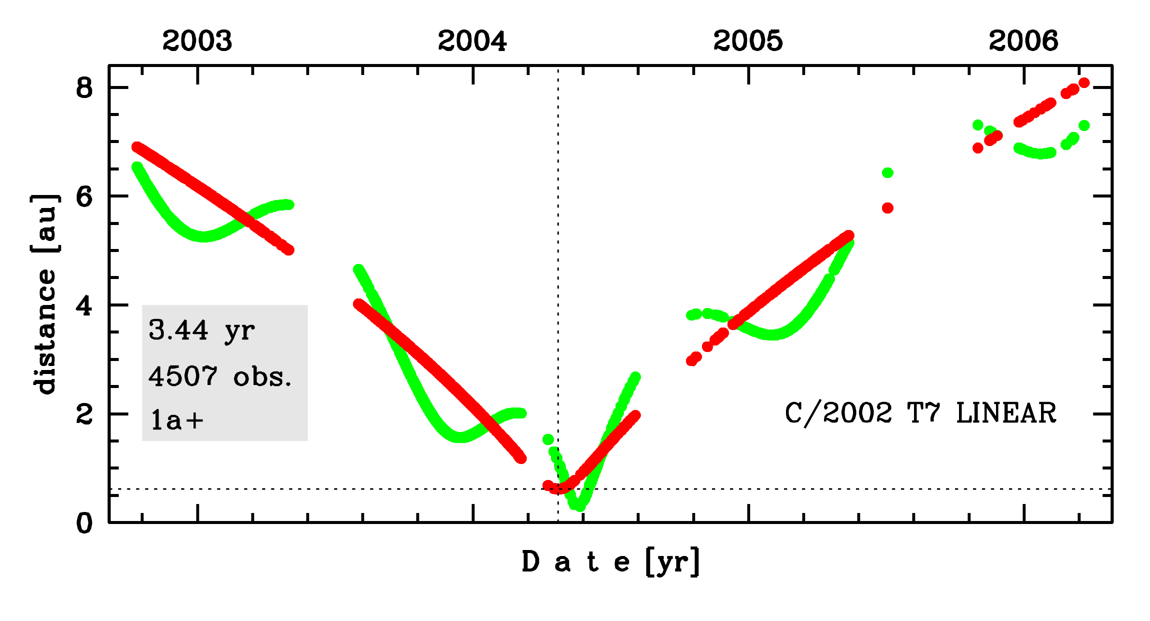 A few other solutions based only of data taken before perihelion are also shown. Three are based on data until 4 December 2003 (p8, pn, pc) and one on shorter data-arc – until 17 April 2004 (p8). This last solution (p8) is about one year shorter than the previous solutions, and is limited to data taken well before the perihelion passage to the heliocentric distance of 2.5 au. This approach on the one hand allowed a reduction in the undesired effects associated with possible outburst events in this comet, and on the other hand allowed maintaining a very good quality orbit (quality reduction from class 1a+ to 1a) that can be used to the dynamical calculations back in time.