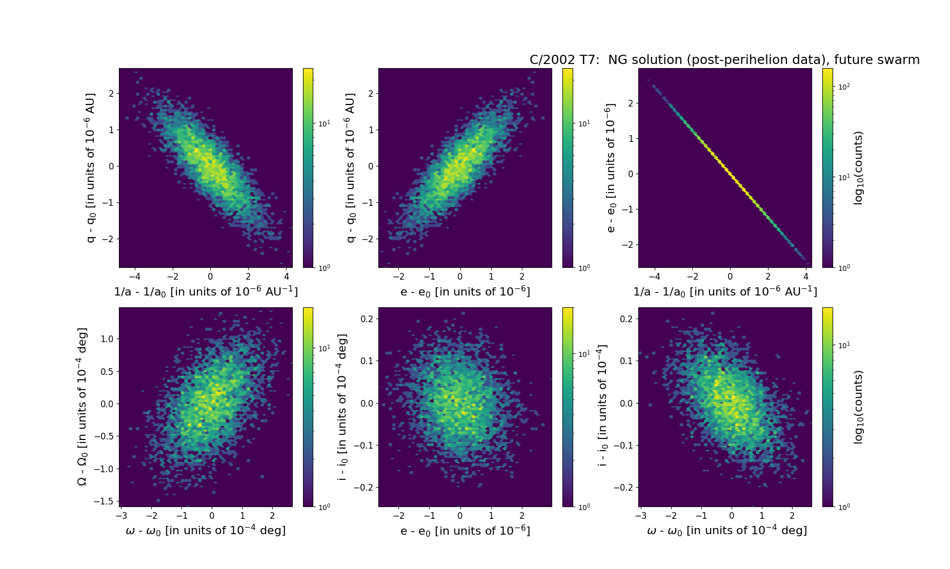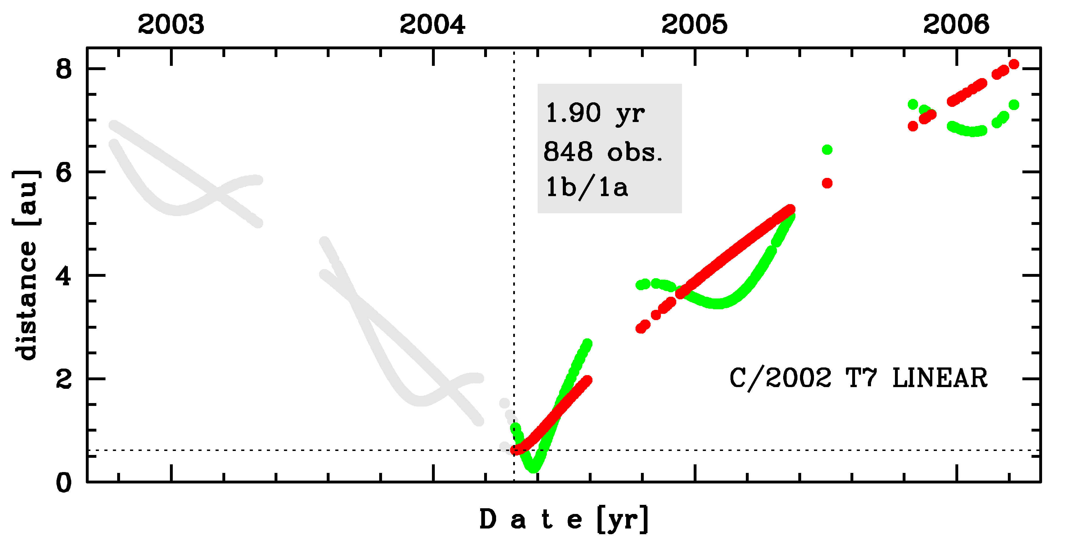 A few other solutions based only of data taken before perihelion are also shown. Three are based on data until 4 December 2003 (p8, pn, pc) and one on shorter data-arc – until 17 April 2004 (p8). This last solution (p8) is about one year shorter than the previous solutions, and is limited to data taken well before the perihelion passage to the heliocentric distance of 2.5 au. This approach on the one hand allowed a reduction in the undesired effects associated with possible outburst events in this comet, and on the other hand allowed maintaining a very good quality orbit (quality reduction from class 1a+ to 1a) that can be used to the dynamical calculations back in time.