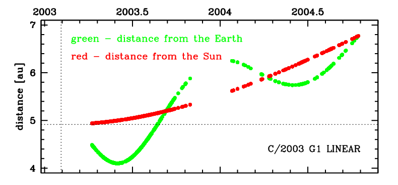 This comet made its closest approach to the Earth on 31 May 2003 (4.103 au), almost four months after perihelion.