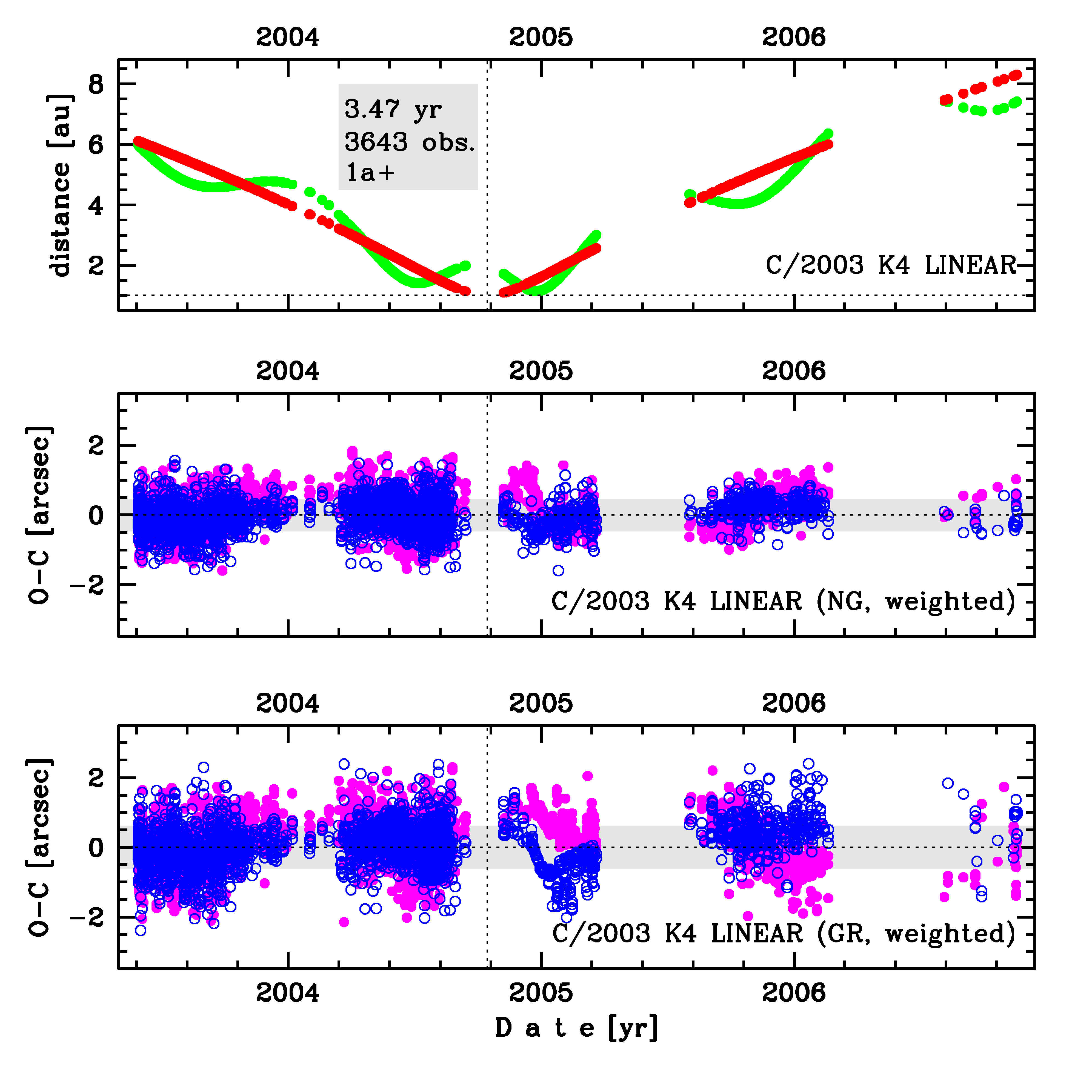 | detectability of NG effects in the comet's motion | comet with NG effects strongly manifested in positional data fitting | |