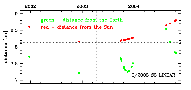 This comet made its closest approach to the Earth on 9 December 2002 (7.216 au), four months before perihelion. However, the second approach to the Earth was on 16 November 2003 (7.256 au, see figure), that is less than two months after the moment of discovery (see figure).