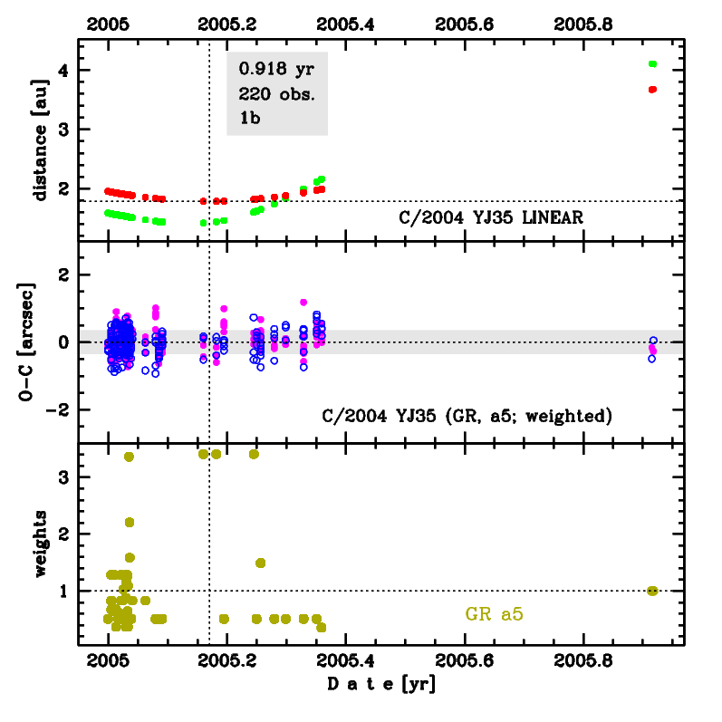GR solution given here is based on data spanning over 0.918 yr in a range of heliocentric distances: 1.95 au – 1.78 au (perihelion) – 3.68 au. NG orbit is not possible to obtain.