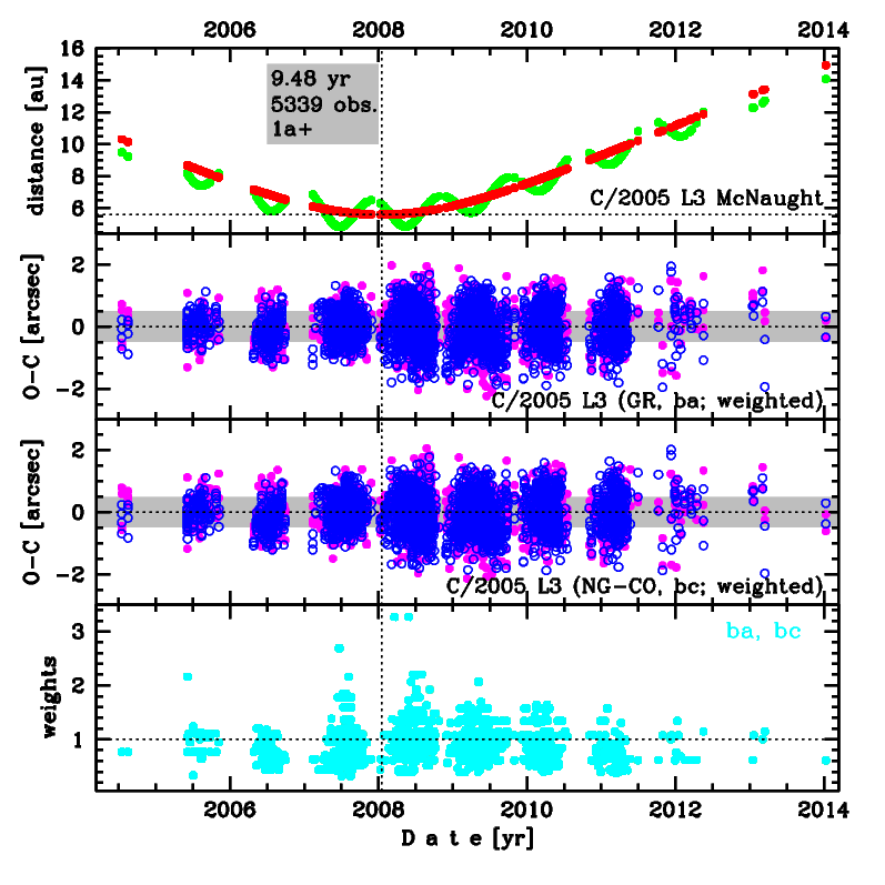 Upper panel: Time distribution of positional observations with corresponding heliocentric (red curve) and geocentric (green curve) distance at which they were taken. The horizontal dotted line shows the perihelion distance for a given comet whereas vertical dotted line — the moment of perihelion passage.
