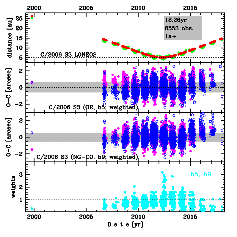 Upper panel: Time distribution of positional observations with corresponding heliocentric (red curve) and geocentric (green curve) distance at which they were taken. The horizontal dotted line shows the perihelion distance for a given comet whereas vertical dotted line — the moment of perihelion passage.