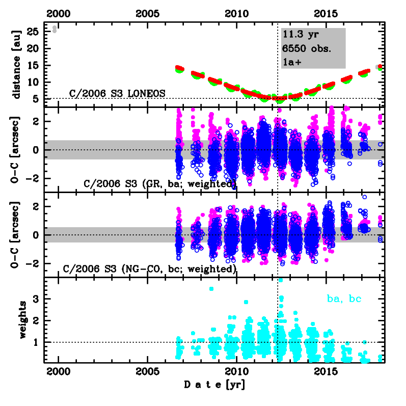 | detectability of NG effects in the comet's motion | comet with NG effects strongly manifested in positional data fitting | |