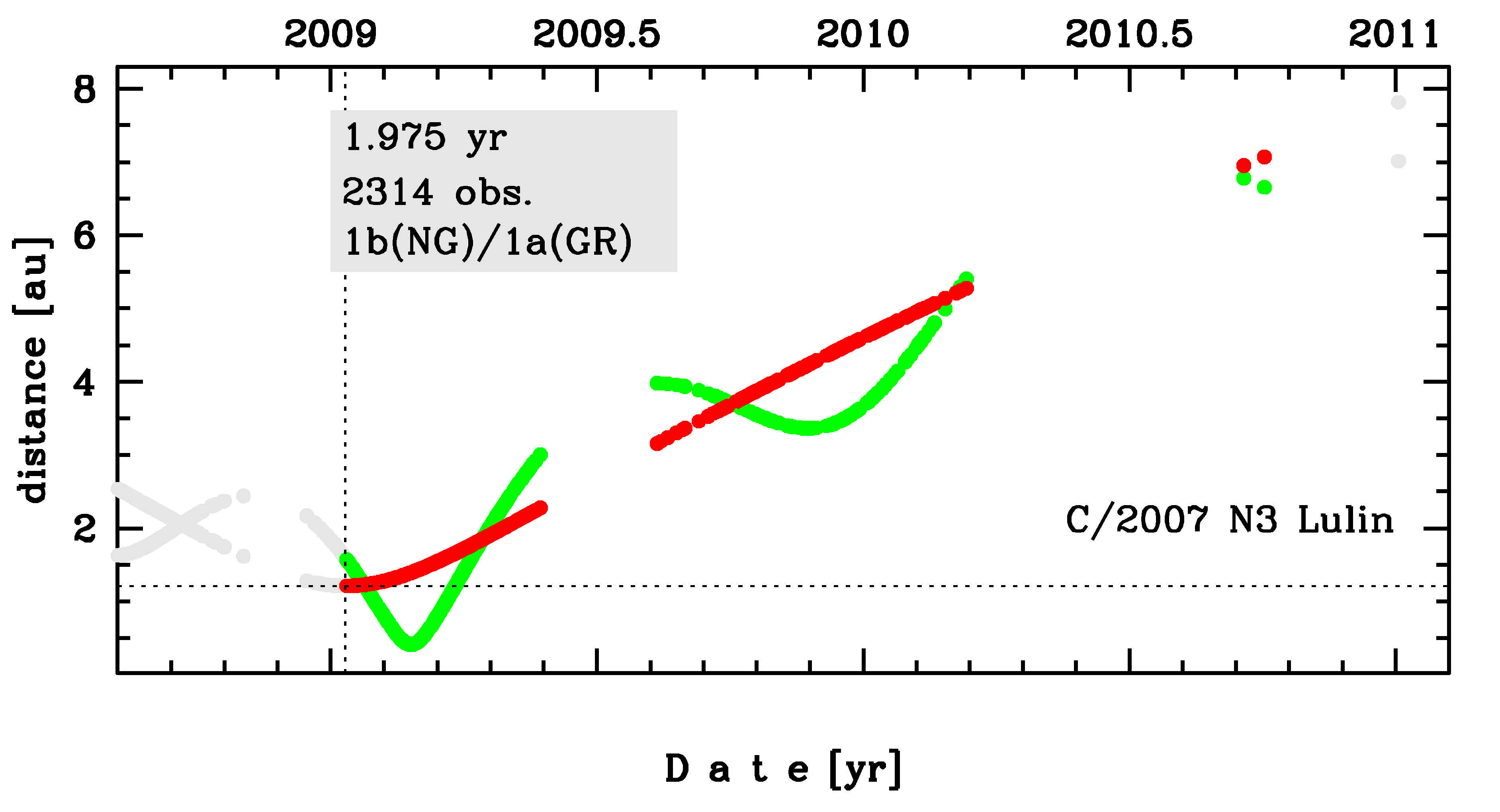 Comet C/2007 N3 was discovered on 11 July 2007 with Lulin Sky Survey (Taiwan); that is about 1.5 years before its perihelion passage. It was observed until 1 January 2011 (see picture).